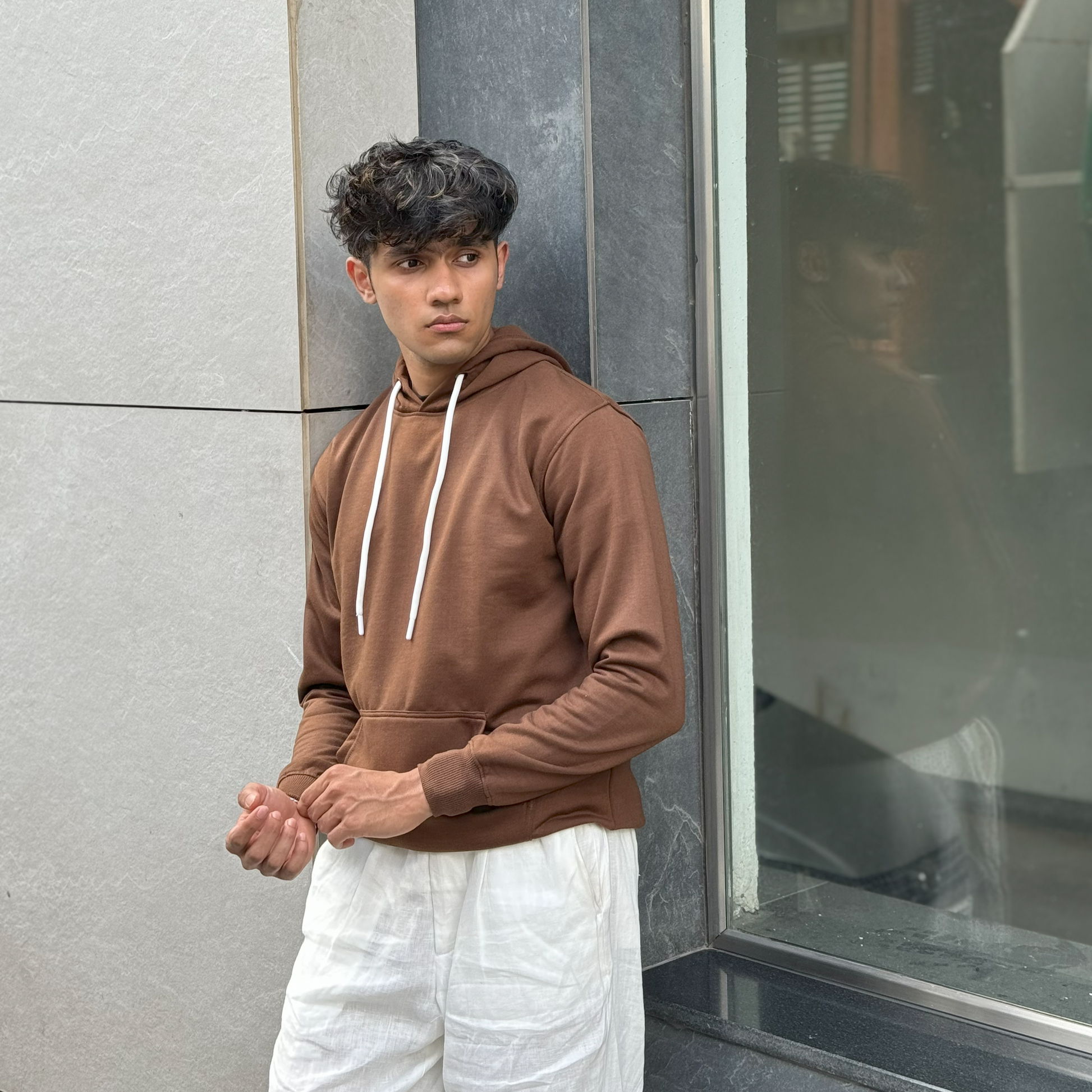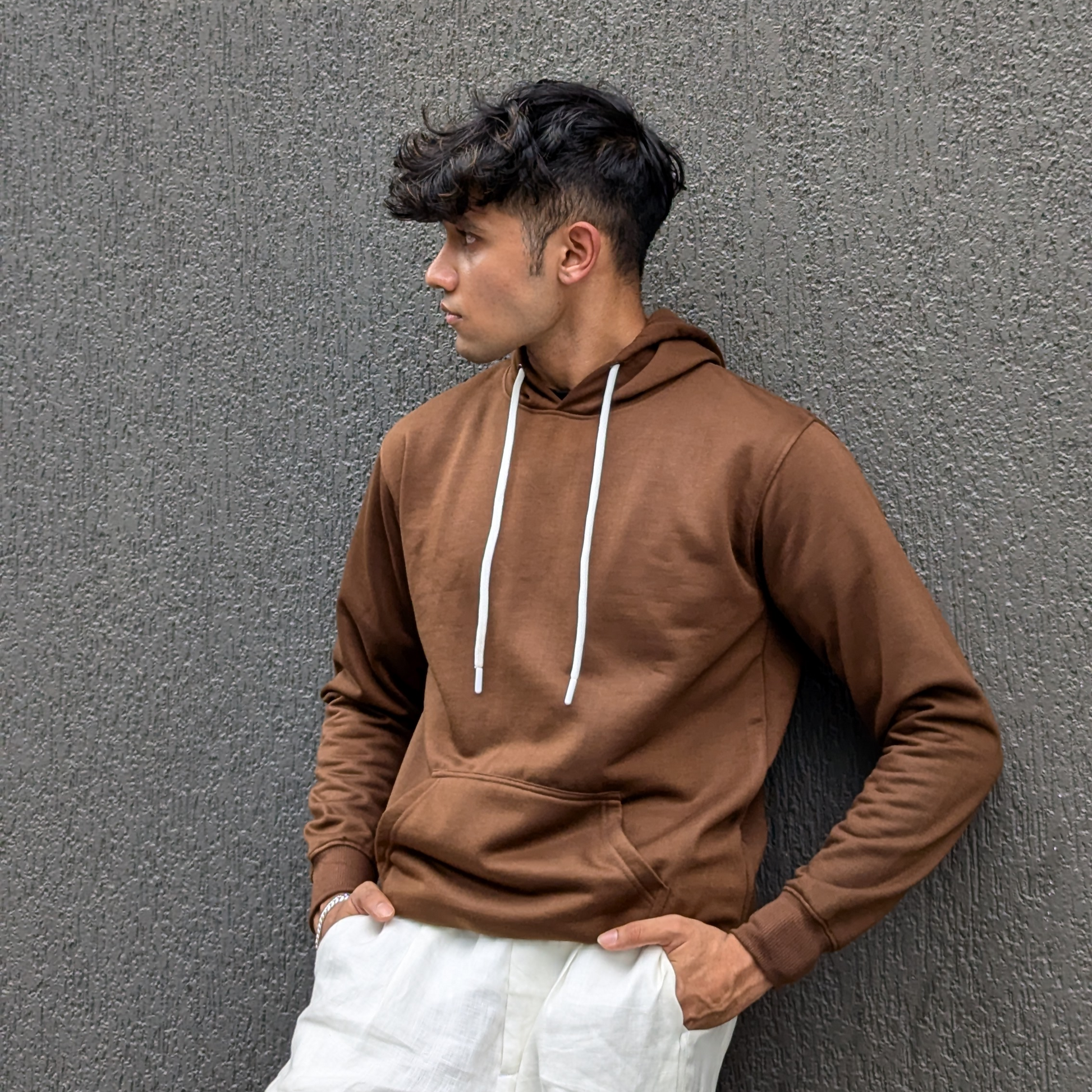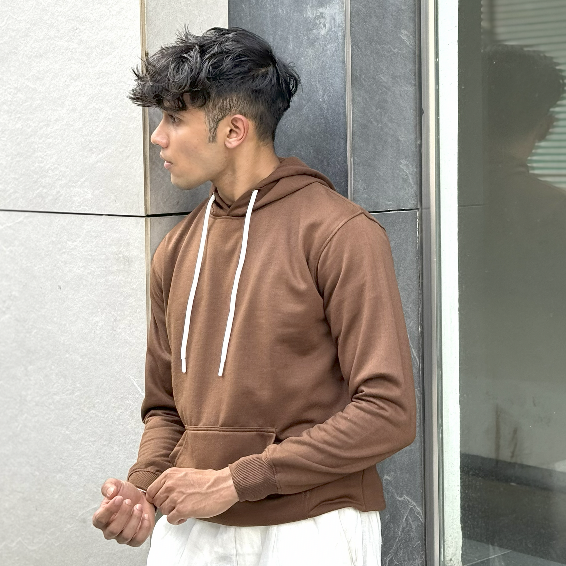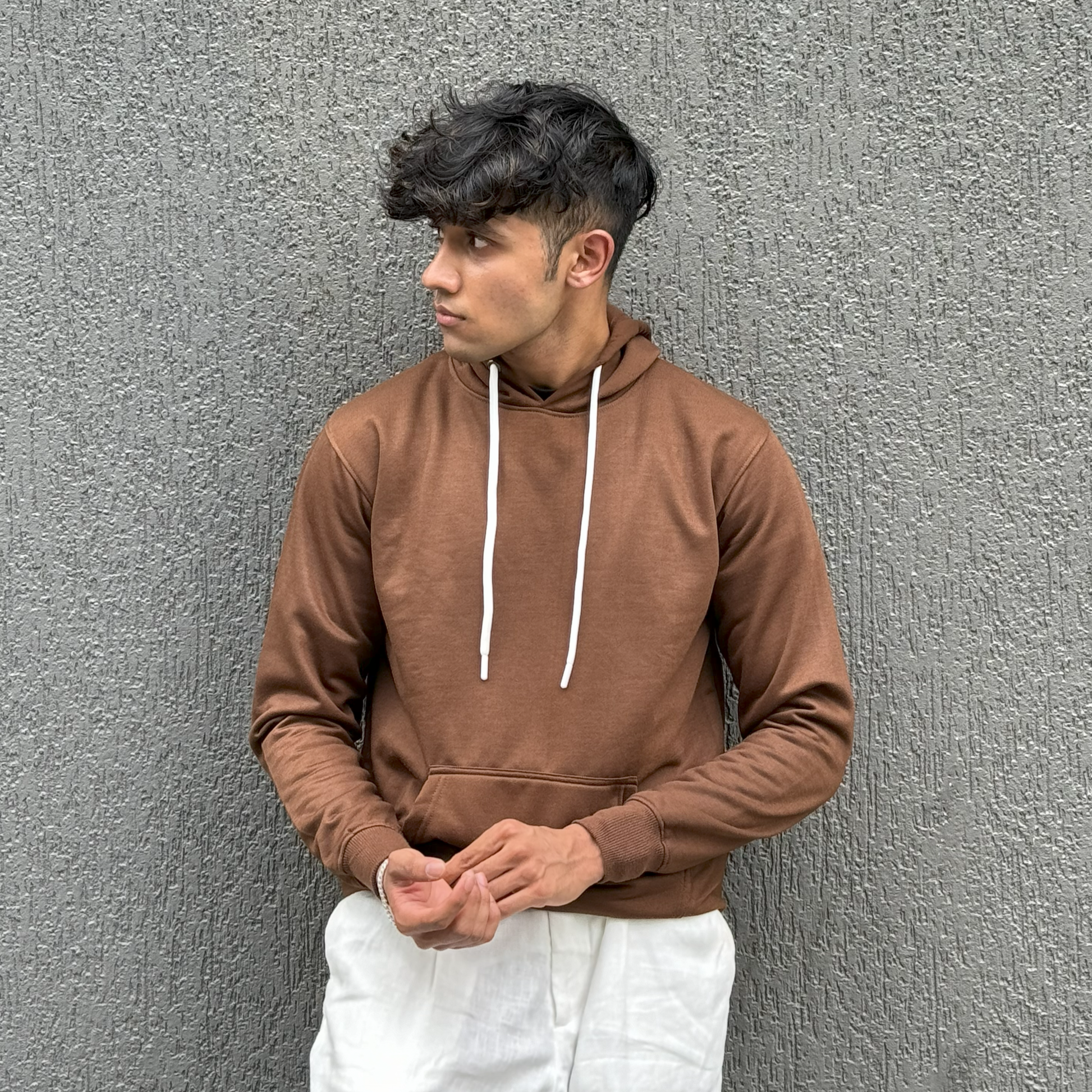 Featuring a rich, earthy brown, it resonates quiet luxury. Made from 100% premium cotton (330 GSM) with a soft brushed interior, double-stitched construction, and ribbed touches. Pre-shrunk, bio-washed, and fade-resistant, perfect for daily wear.
